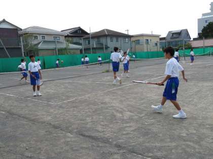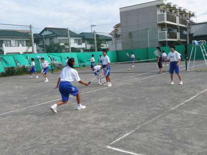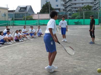 1年2組の体育の授業の様子です。ソフトテニスをやっていました。前回、教室で基礎用語等を学習してあります。今回は第1回目の実技でした。テニス部のメンバーが模範演技をしていました。ラケットを思うように扱えず、悪銭苦闘している人もいましたが、とても楽しそうでした。
