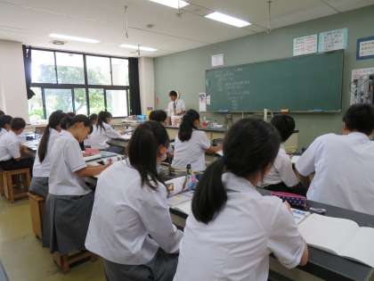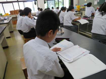 1年4組の理科の授業の様子です。物質の状態変化について考えていました。個体・液体・気体と変化することを水を例に話し合っていました。