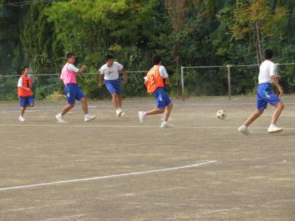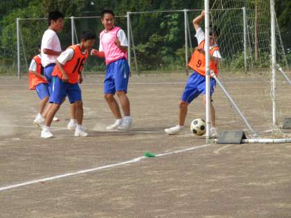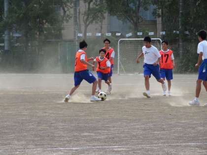 2年2組の体育の授業の様子です。サッカーの学習1時間目です。単元の課題を見つけるために、まずは試合を行っていました。