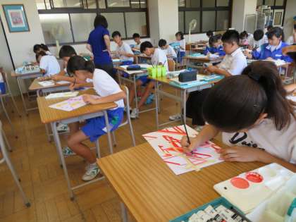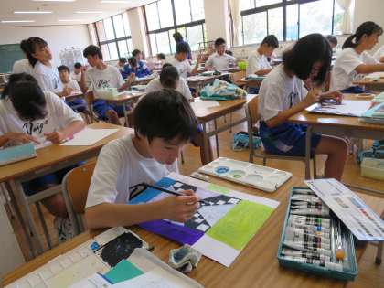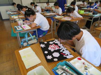 2年4組の美術の授業の様子です。立体感のある平面構成を考えて作品を作っていました。そのための効果的な彩色について、明度、色相、平行な面の関係を意識して取り組んでいました。