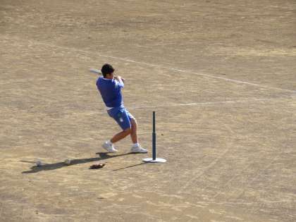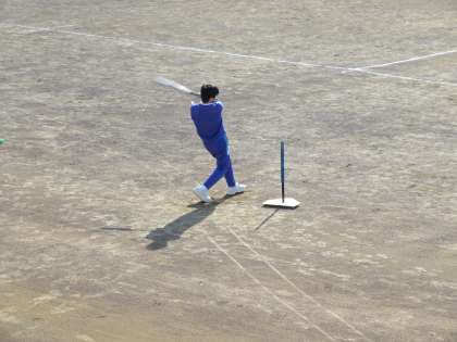 3年2組、体育の授業の様子です。ソフトボールの練習をしていました。バッティングティーにボールを置いて繰り返し打ったり、野球経験者からアドバイス受けたりしていました。運動場いっぱいに広がって清々と体を動かしていました。