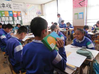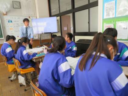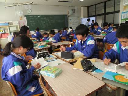 2年2組、英語の授業の様子です。「職場体験を1年生に伝えよう」という課題のもと、英作文に取り組んでいました。1年生によく分かってもらうために、易しい単語を使って、ゆっくりはっきり話すように心がけるそうです。伝えたいことをウェビングで整理したり、辞書を使って単語を調べたり、よりよい表現を友達と確認し合ったりしていました。交流会は来週だそうです。1年生の皆さん、楽しみにしていてください。