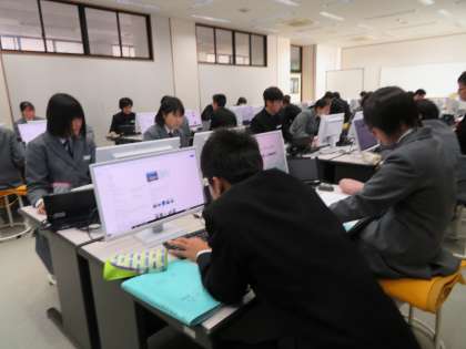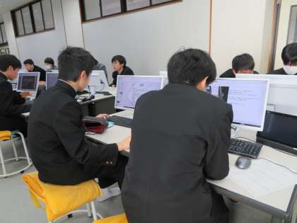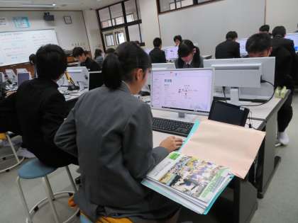 3年1組、総合の授業の様子です。高校訪問のまとめとして、高校紹介プレゼンテーションを作成していました。見学したことや説明を受けたことなどを取捨選択して5枚程度のスライドにまとめるそうです。読解や理科などの他教科でもパソコンを活用しているので、操作方法がよく身に付いています。
