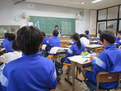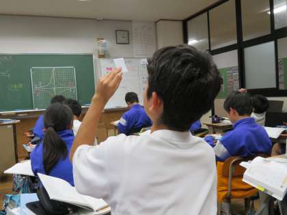 1年3組、数学の授業の様子です。「反比例のグラフはどのようなグラフだろう?」という課題のもと、実際にグラフを描いて、その特徴を考察していました。グラフを描いた紙を軸で折ると、ぴったり重なることを発見していました。