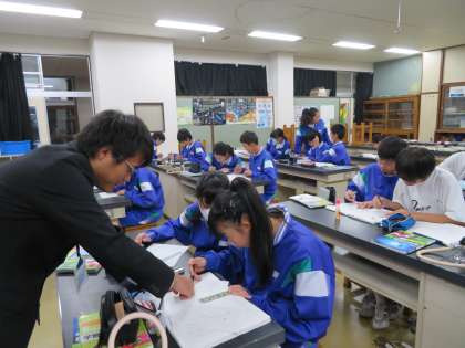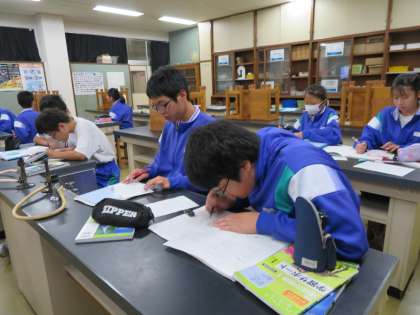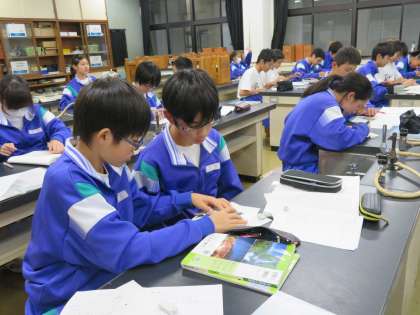 1年4組、理科の授業の様子です。「光はどのように反射するのだろか。」という課題のもと、光の進み方について考察していました。物体と像とは鏡に対して対称の位置にある、光源から像に向けて光が直進しているように見えることが分かりました。これらの法則を使って、応用問題を解いていました。