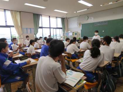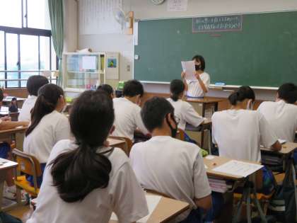 2年3組、読解の授業の様子です。「自分の想いを伝えるためには、どう発表すればよいだろうか?」というテーマで、五中を紹介するポスターを発表し合っていました。