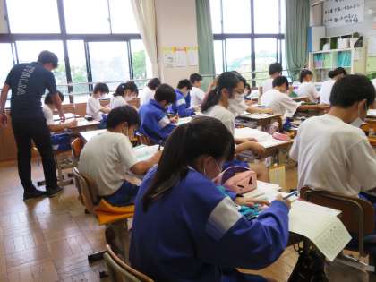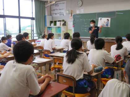 3年2組、英語の授業の様子です。「4つのR」について書かれた文章を読んでいました。単語練習をしたり、made from〜、made of〜の使い分けを覚えたりしていました。絵カード、単語カード、動画など、さまざまな資料を活用して授業が進められていました。