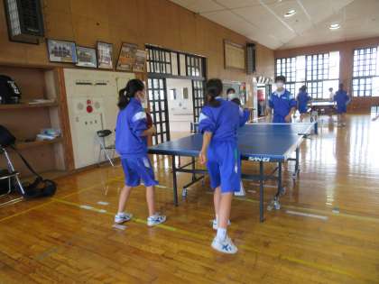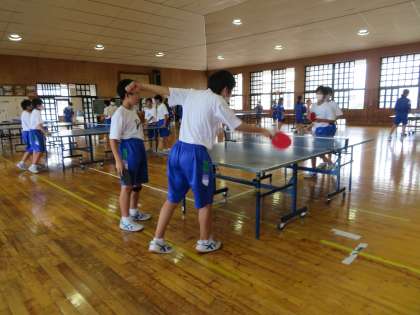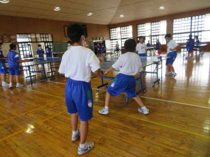 1年3組、体育の授業の様子です。卓球に取り組んでいました。「もう1度ルールを確認しよう。」という課題のもと、ゲームをしながらサーブの順番や交代の仕方などを理解していました。