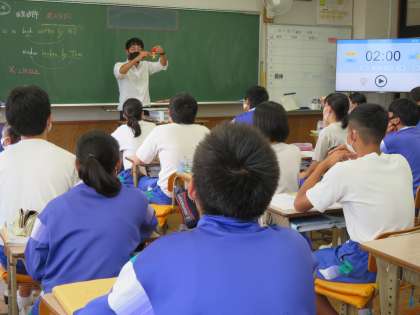 3年生、英語の授業の様子です。先生が本文を読んでいました。紙芝居や実物の剣玉を取り入れた読み聞かせは、大変分かりやすかったです。みんなよく聞いていました。今日のポイント、後置修飾の理解も進みました。