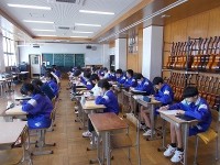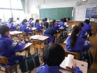 2年生が多目的ホールで自然教室の説明会を開いていました。本年度は新型コロナウイルス感染症拡大防止を考え、宿泊はなしとしました。11月16日と17日の二日間、日帰りで実施します。1日目は函南のオラッチェに、2日目は伊豆高原に行き、日頃できない体験活動を行う予定です。