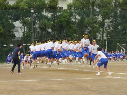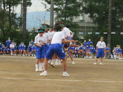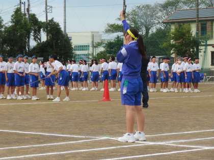 競技が始まりました。まずは長縄1年の部です。緑が1組、黄色が2組です。先生から激励が飛んでいます。