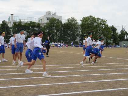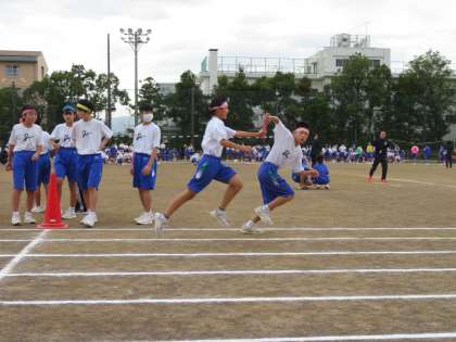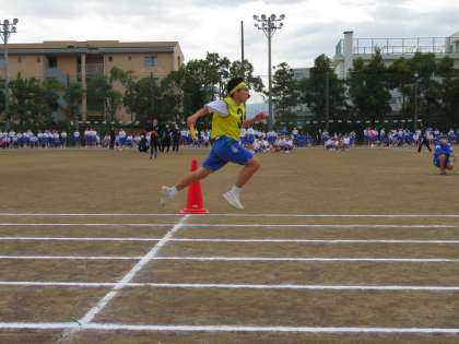 アンカーにバトンが渡りました。力づよい走りです。1位は2組でした。優勝、おめでとう!