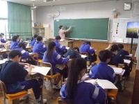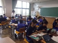 1年3組、国語の授業の様子です。言葉について調べたことを伝え合っていました。プレゼン力は現在社会において不可欠な力の1つです。まとめたことをいかに聞き手に分かりやすく伝えるかを意識して、表現していました。