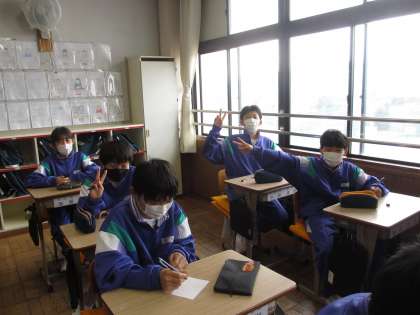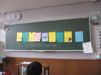 中学生になって、自分の感じたことや、未来の希望を作文に書いています。黒板にはクラスみんなの誕生日を祝うための掲示がありました。
