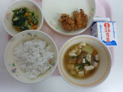 鶏の唐揚げ 茎わかめと野菜の炒め物 けんちん汁 麦飯