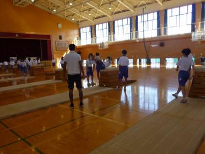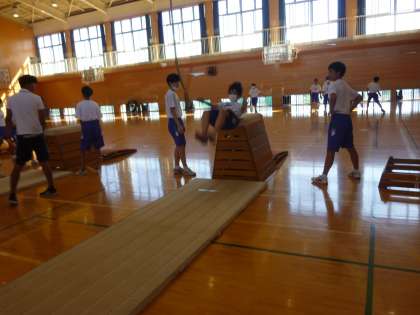 台上前転を自分の今に合わせて課題を設定し、助け合いながら取り組んでいます。