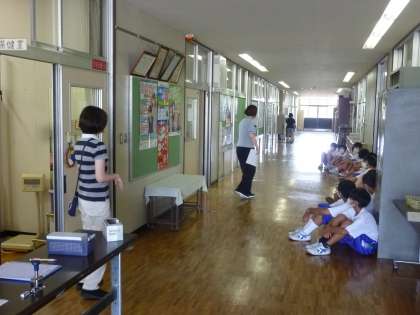 本日の午前中は、1年生がモアレ検査(脊柱側わん症検査)を行っています。