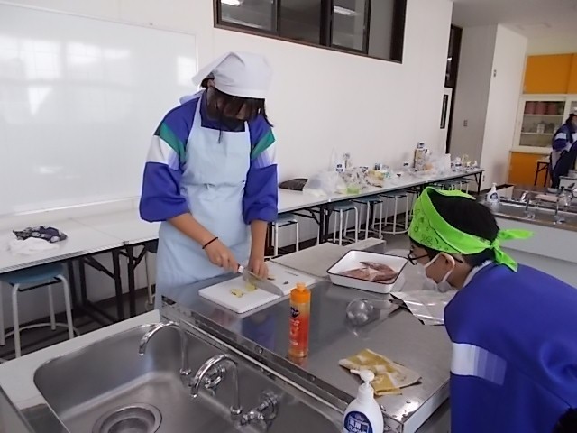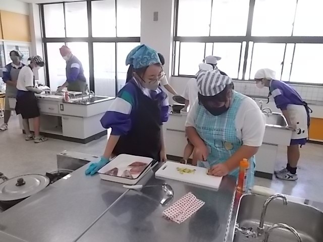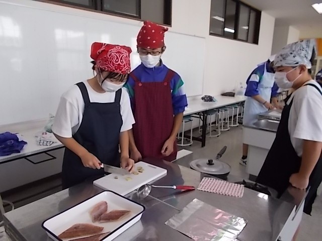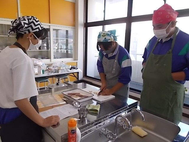 家庭科の授業です。調理実習を行っています。班で協力してメバルの煮付けを作っています。調味料の分量を間違えると味が調いません。みんな慎重に量っています。