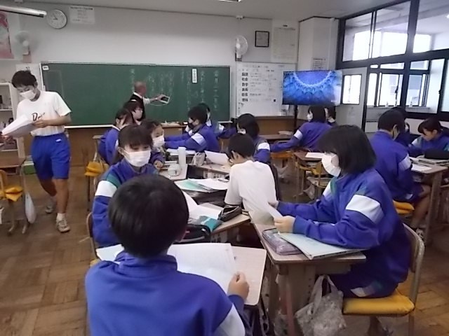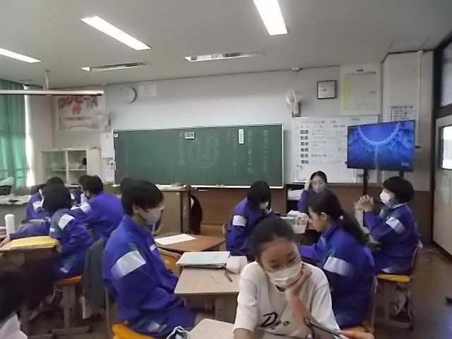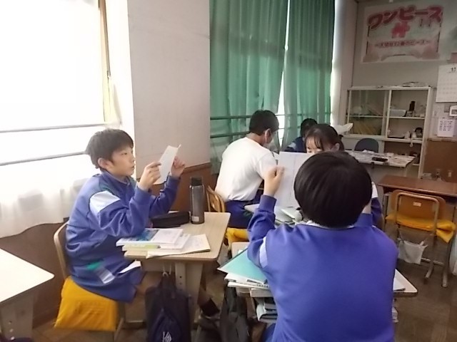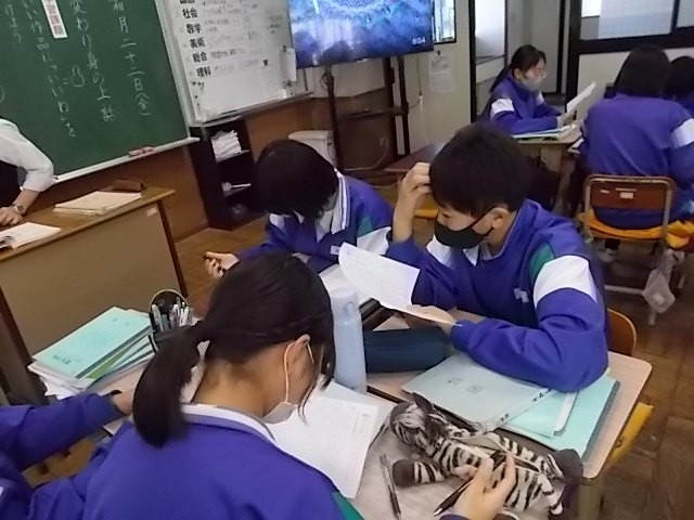 国語の授業です。身代わり身の上話を作って読み合っています。目覚まし時計やテニスボールの気持ちになって書いている生徒もいました。とてもユニークな話ばかりです。