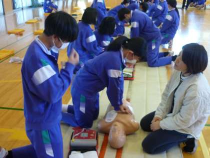 心臓マッサージと人工呼吸、AEDの使い方を身体で覚えます。