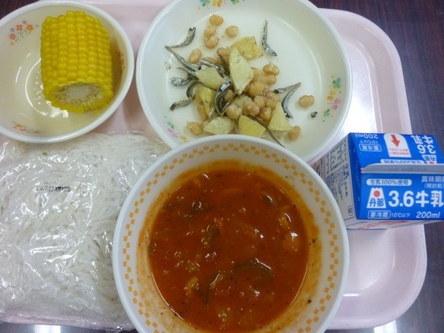 つけナポリタン 大豆と小魚の揚げ煮 ゆでとうもろこし 牛乳