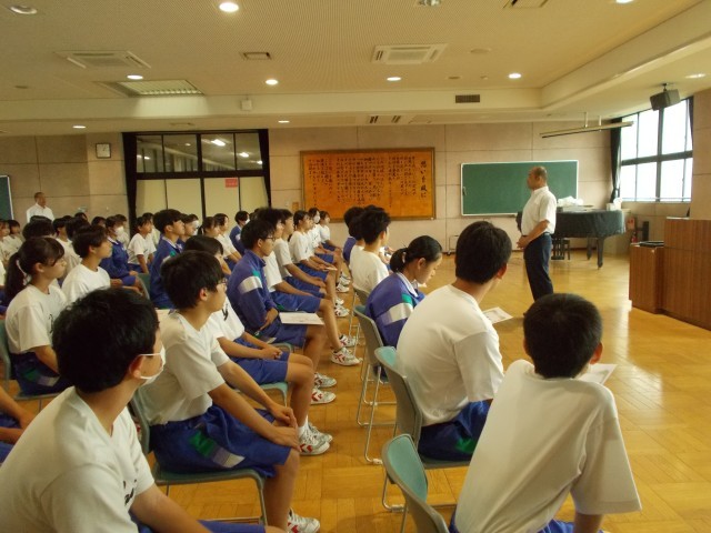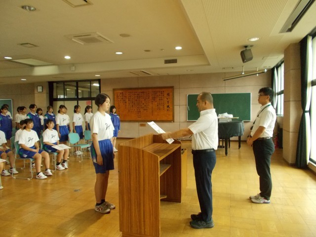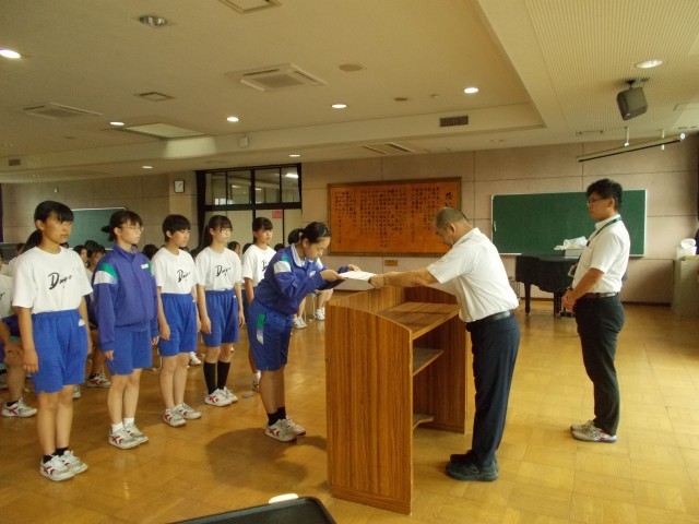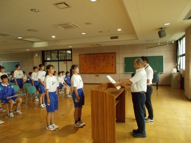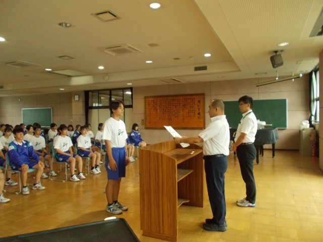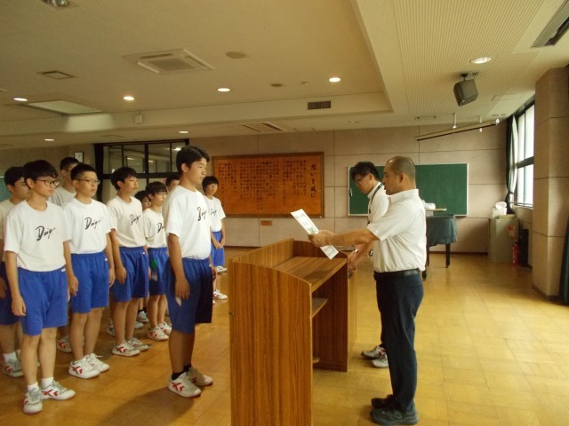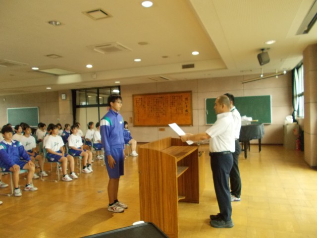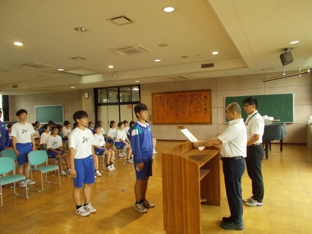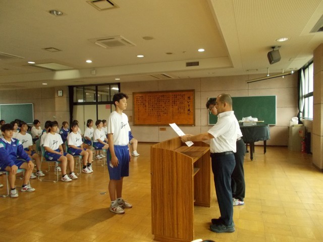 本年度の中体連市内大会で優秀な成績を収めた部活の表彰がありました。その後の校長講話でスポーツを通して優しい人になってもらいたいとの話がありました。