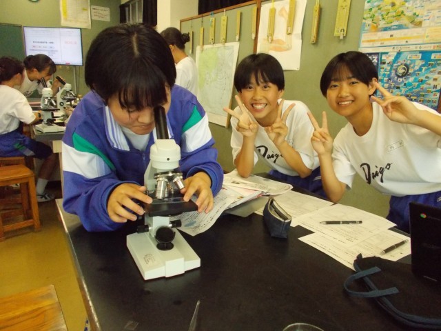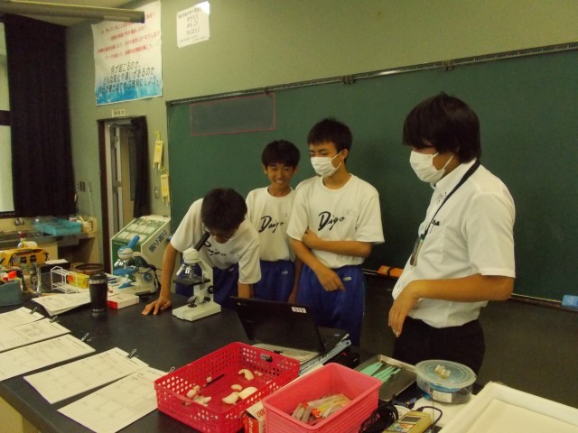理科の授業です。玉葱の細胞を顕微鏡で見ています。