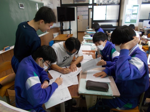 国語の授業です。文法の学習をしています。自分たちで相談しながら答え合わせをしています。