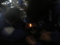 13の理科では、鏡にうつる光の屈折について理科室を暗くして実験を行っています。実...