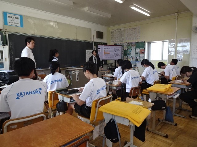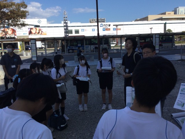 3年生の「防災」グループは、こども園とタイアップした避難訓練です。また午後は非常食の試食や防災倉庫の中身の点検や使い方を学習しました。どれだけの水が必要になるかなど意欲的に考えていました。「高架化」グループは、駅周辺から片浜地区の各所を見学して回りました。「企業や金融」のグループは、事業所にお邪魔して、それぞれの取り組みや理念について話を伺っていました。2年生の時の職場体験では気がつかなかったことがたくさん発見できたようです。「歴史」グループは、午前中の校区の歴史探検後、誠恵高校の歴史探究倶楽部の顧問と代表生徒に来ていただき探究の仕方を学びました。とても有意義な時間を過ごせ、どの生徒も様々な発見をしたようです。ご協力いただき、ありがとうございました。