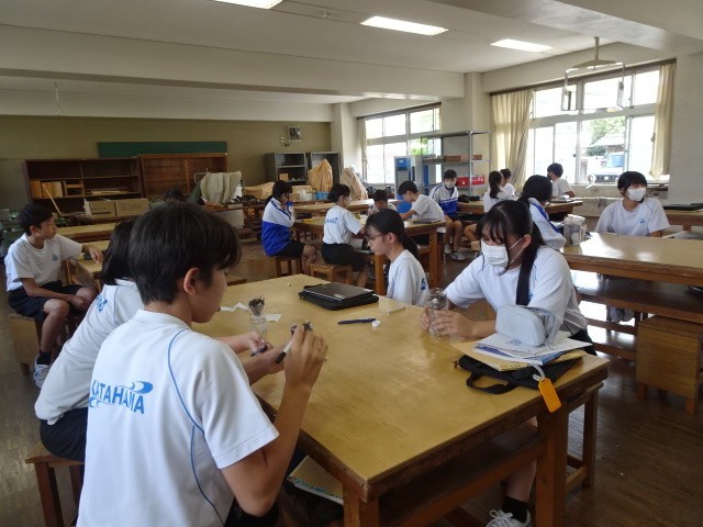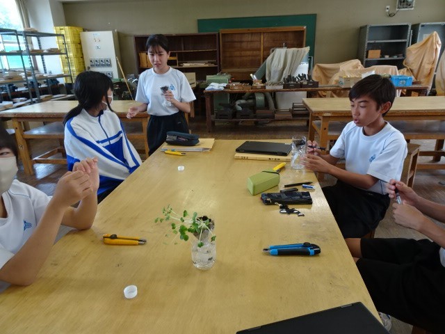2年B組は技術家庭の技術分野です。生産活動の学習で、かいわれ大根?の種まきをしました。ペットボトルを切って2段にして、水を入れた下の段から脱脂綿を伸ばし、毎日水やりをしなくてもよい毛細管現象を利用した装置を各々が作りました。1週間置くと、2枚目の写真中央のように発芽して元気な苗が出ます。今回、写真のものよりも多く種を蒔きました。来週の技術の時間、どうなっているか楽しみです。