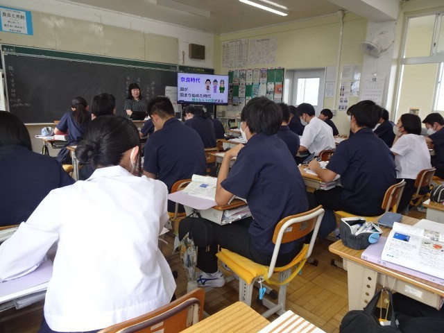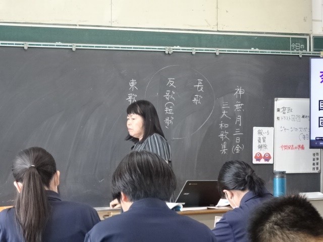 3年生は国語です。万葉集の学習でした。長歌、短歌や防人の歌(東歌)などについて知りました。有名だけどちょっと道徳的にどうなのという歌、親子や夫婦の心情が込められた歌、郷土の人が詠んだ歌等、様々な歌を味わいました。