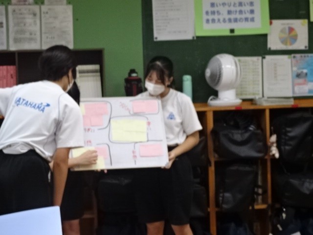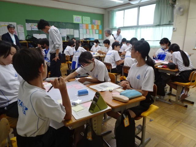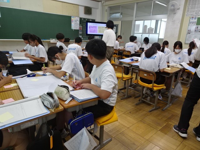 2年生も総合的な学習の時間です。職場体験で考えたこと、働く人の思い、働くことの意義等について自分でまとめたことを、班の仲間に伝え、共有したり違いを知ったりしました。これから、お世話になった事業所のポスターつくりにチャレンジしますが、それらの特徴が出てくるとよいと思います。