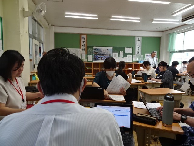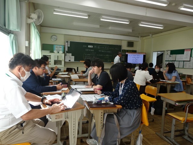放課後、生徒が帰った後は、片浜小中の教員による合同の研修会を行いました。5時間目の総合の時間を中学校の教員が全員で行った授業を小学校の先生方に見ていただきました。それをもとに、授業の様子から今後の片浜小中の総合の授業の在り方を考えました。また、児童生徒の1学期末のアンケートから、小中一貫教育の目指す姿について情報の共有や取り組みたいことについて話をしました。