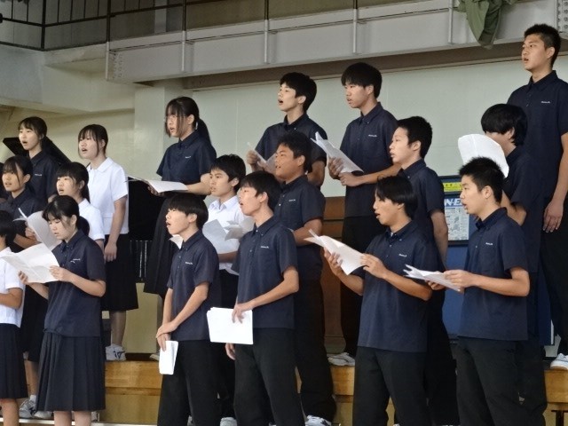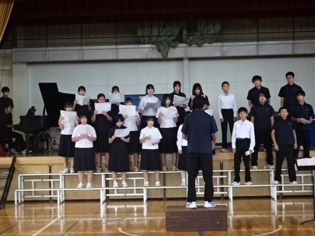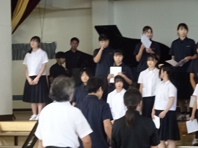 3年生は、潮会文化の部で歌う合唱のリハーサルでした。座席、出入り、歌う位置等の確認をしました。さらに、互いに歌い合い出来映えを確認していました。