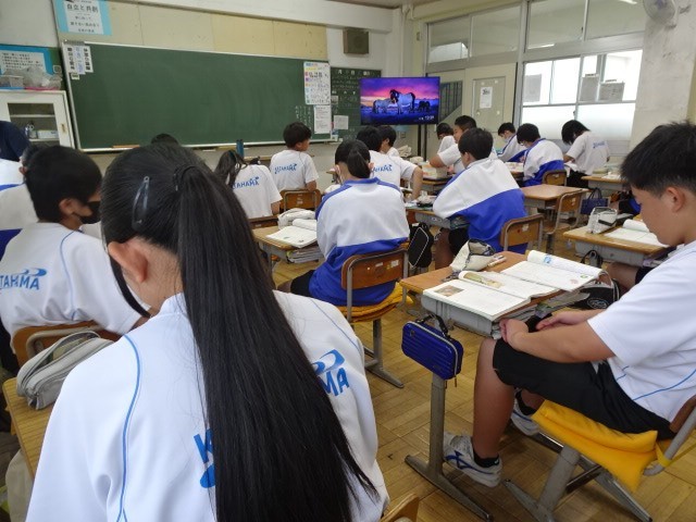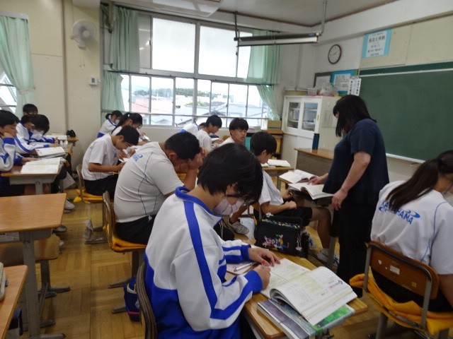 2年A組も国語です。古典「枕草子・徒然草」のまとめでした。ワーク等自主学習を行いながら、暗唱にも取り組んでいます。