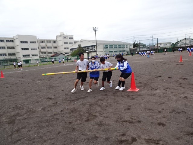 潮タイムは縦割り種目の練習です。リレー、台風の目、綱引きに分かれ、前回の反省を踏まえて改善点を挙げ、練習をしていきました。台風の目を比べていただくと、赤と白でコーンを回る姿勢が違うことが分かると思います。当日、どうなるでしょうか、楽しみですね。