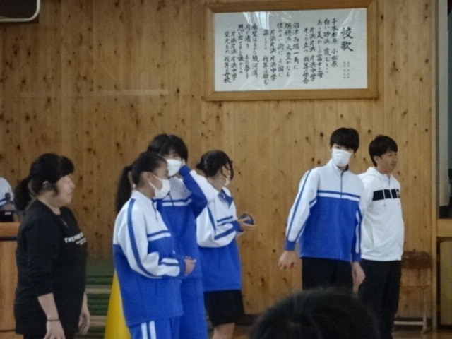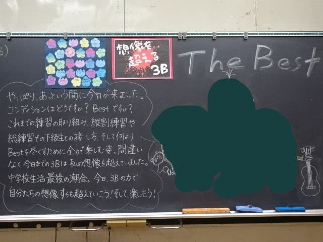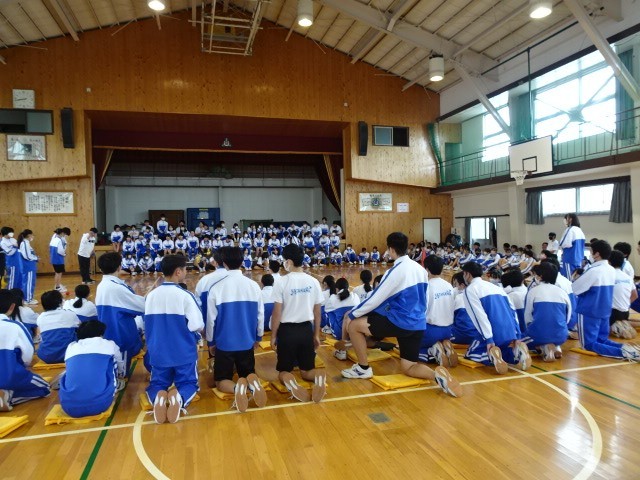 本日は、潮会体育の部です。あるクラスの黒板メッセージです。前日からの雨が心配されたとおり、グラウンドは水たまりがありました。通常登校でしたが、競技のスタートや日課を入れ替えて行いました。まずは、ボッチャ選手権です。先日まで、主催者チームへの挑戦権を得る決勝出場大会を行ってきましたが、本日が優勝決定戦です。主催者チームは昨年度優勝しているので、挑戦者チームは連覇を阻止すべく息巻いていました。接戦に継ぐ接戦で、会場は大盛り上がり。体育館の外にまで大きな歓声が響いていました。優勝は、挑戦者チームでした。
