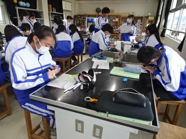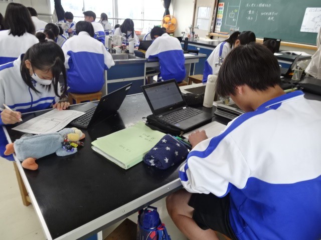 3年A組は理科です。浮力の学習もまとめに近づいています。水圧は深さに関係しているのに、浮力は深さに関係しないのかという問いに対し、浮力と重力の関係性から図を使って説明できるようにしていました。
