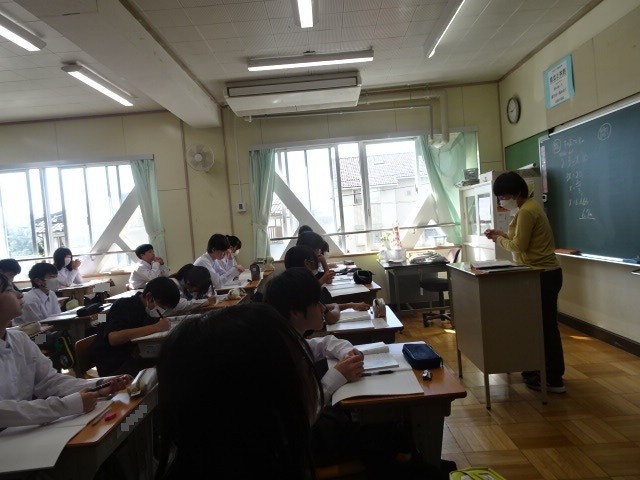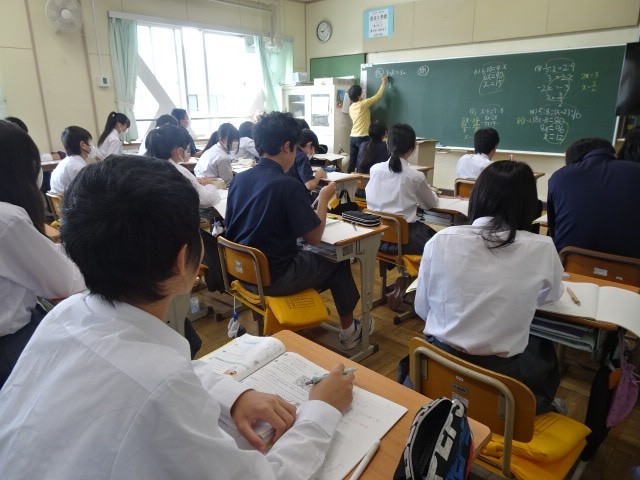 1年A組は数学です。一次関数の中の比の学習です。比の式を使ってXの値を求ることができるようになり、応用として小数で表す場面でした。分数で表した値を小数第1位までの数に表しましたが、そもそも第何位を四捨五入するのか、第1位はどこなのかをしっかり全体で確認しました。。