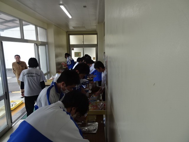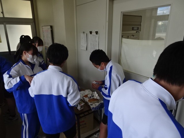 今日の昼食は、非常食です。コッペパンにソーセージ、そしてカップスープがメニューです。3年生の総合の「防災学習」グループ15名が、4時間目の総合の時間に準備に入りました。まずは、15名全員でパンにソーセージを乗せ、アルミホイルで包み、牛乳パックに入れるところまで180本を一気に作りました。