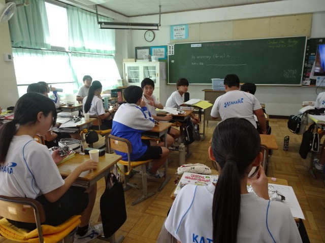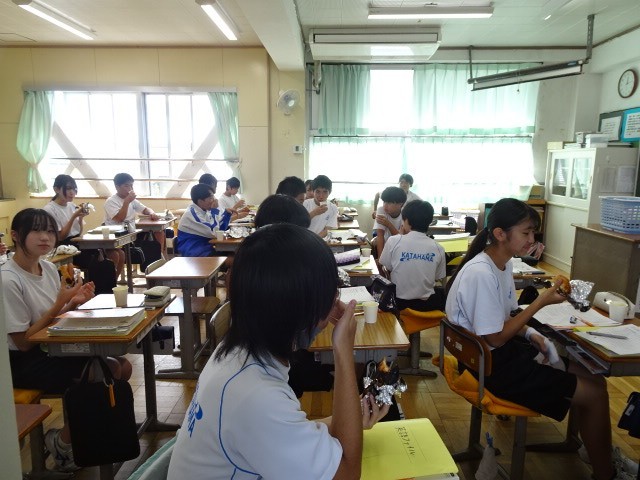 パンとスープの準備ができたクラスから、食事です。3年生の防災グループや地域のサポーターの方々のおかげで、とても手際よく配膳にこぎつけました。パンは、上手に焼けたものもありましたが、焦げてしまって1本全部は食べられないものもあり、予備のパンを配りました。満腹にはなりませんが、炊き出しの一助としてよい体験になったと思います。