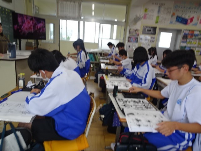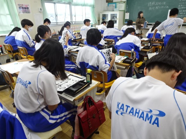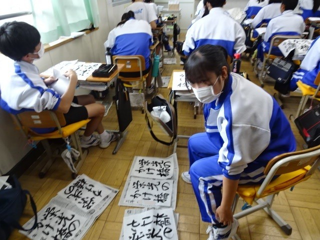3年A組は国語で毛筆です。今日は課題の「栄光のかけ橋」の清書です。集中して書きましたが、どれにするか迷っていました。