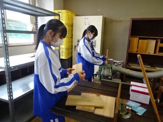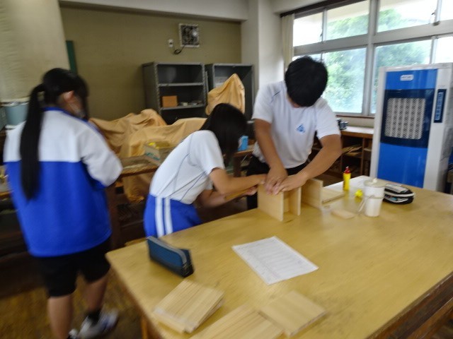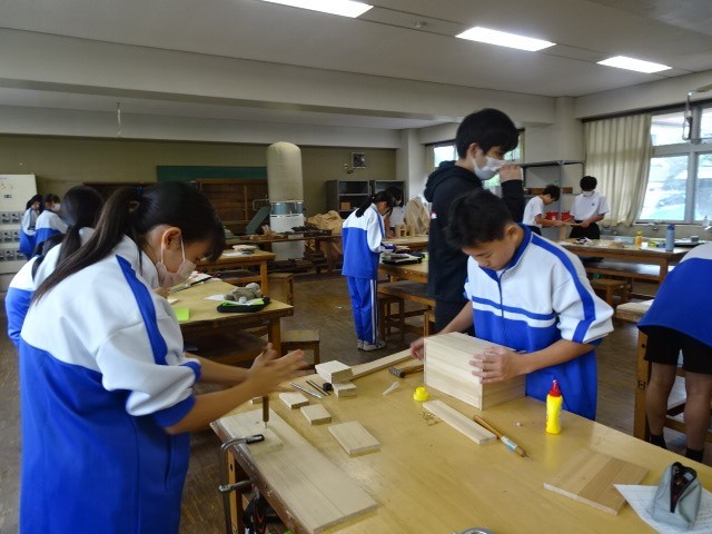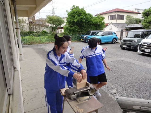 1年B組は技術家庭の技術です。本立てを作っています。型を取って切る作業、釘穴を錐で開ける作業、切り取った部品に磨きをかける作業、釘打ち作業と、仲間にも手を貸してもらいながら各自の作業を進めていました。