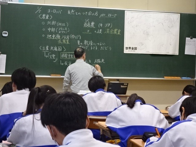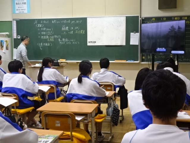 1年A組は社会です。ヨーロッパ州の自然についての学習で、イタリア料理(パスタやピザなど生徒が好きなもの)の特徴から農業がさかんな国々の特性(特産物など)を捉えていました。また、産業革命によって自然が破壊されたことを踏まえ、環境を大事にしている先進的な取組について学んでいました。