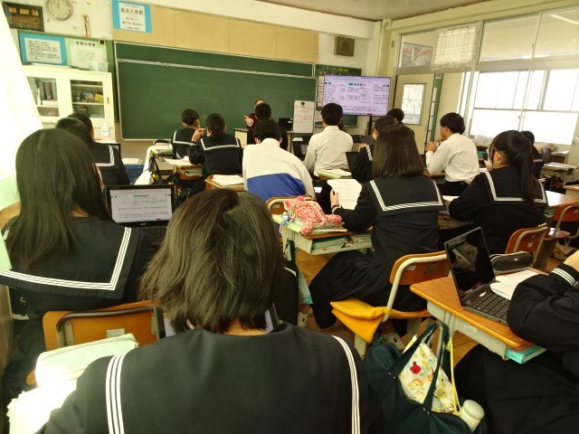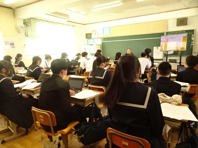 3年A組は社会です。定期考査の振り返りや解説をしていました。昨日のコミ祭の時の笑顔から一転、真剣な表情です。