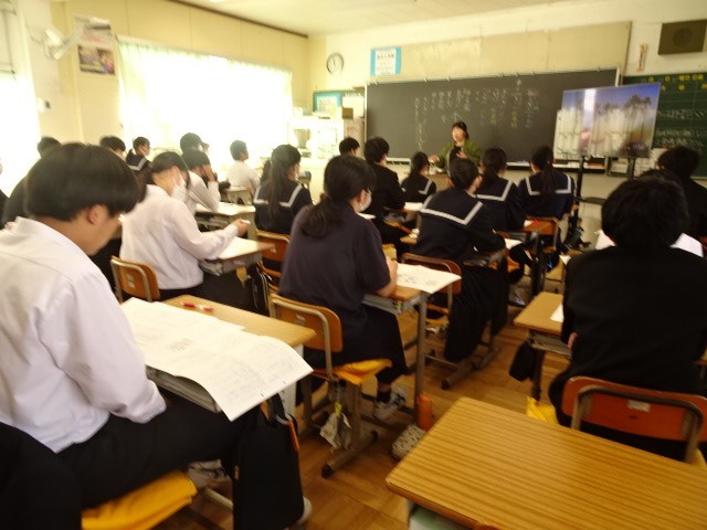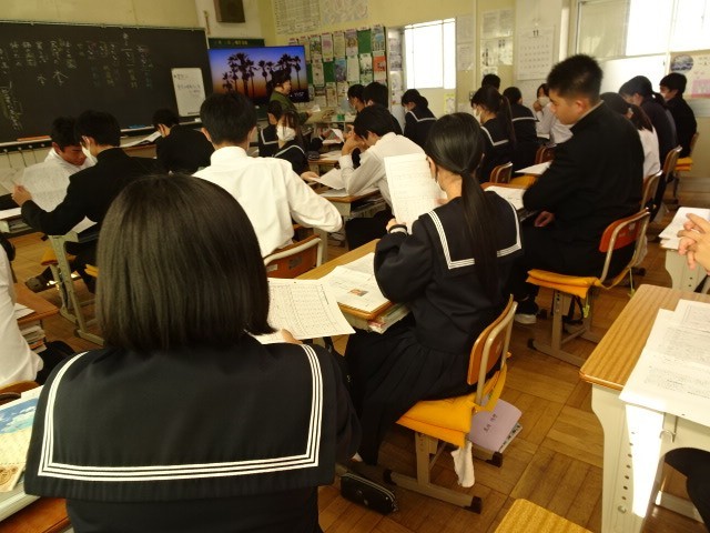 3年B組は国語です。こちらも定期考査の解説をしているところです。一通り解説が終わった後、隣席同士で、「ここってどうなの?」「漢字、分かった?」などと確認し合っていました。