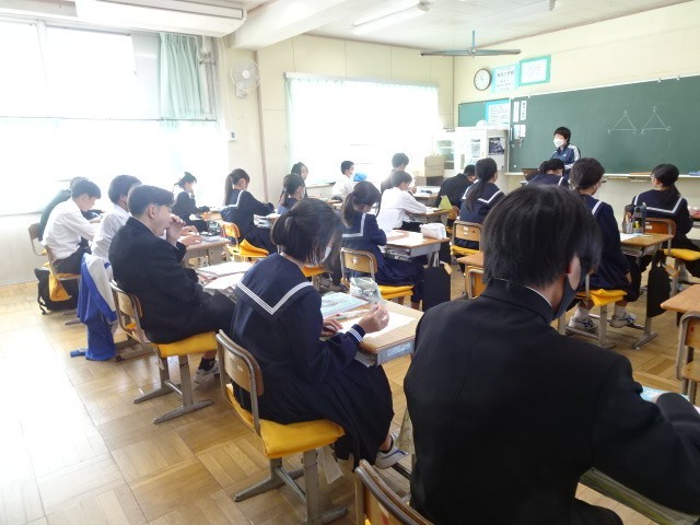 2年B組は数学です。合同な図形の学習でした。線対称の合同な五角形のどことどこが対応しているのか見比べ、全体で確認していました。また、辺の対応の表記もABとFG、IHとDCというようになることも覚えました。