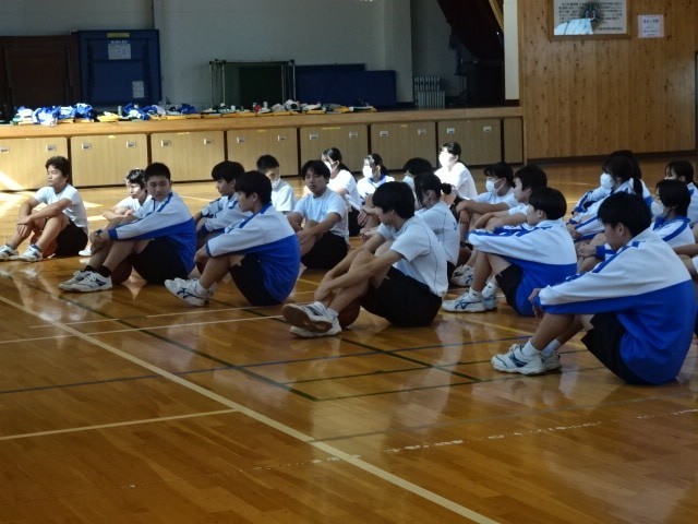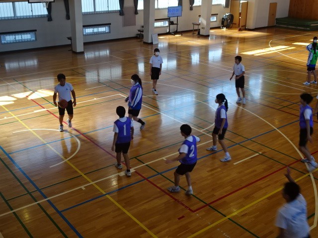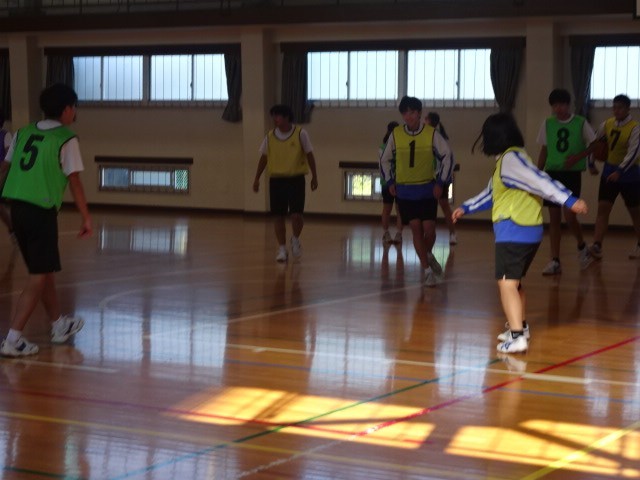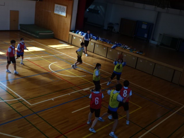 3年B組は保体です。3年生は、バスケットボールの授業が始まりました。ウォームアップの後、ルール等の確認をして、ゲームに入りました。とても盛り上がっていました。