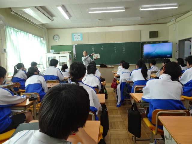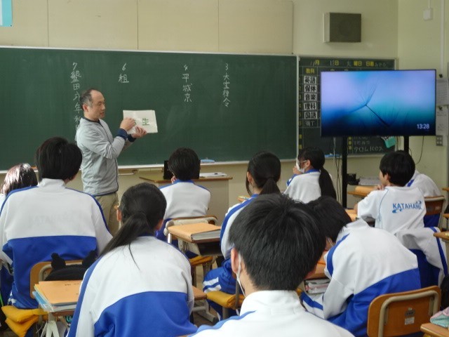 1年A組は社会です。歴史分野に戻りました。まずは、時代名の確認をしました。縄文、弥生…、安土桃山、江戸と声に出して楽しそうにフラッシュカードを読んでいました。緑の文字と黒文字で表した時代名に共通する物が何かと考えながら確認しました。本日は、黒文字の最初の時代名「飛鳥」についての学習です。
